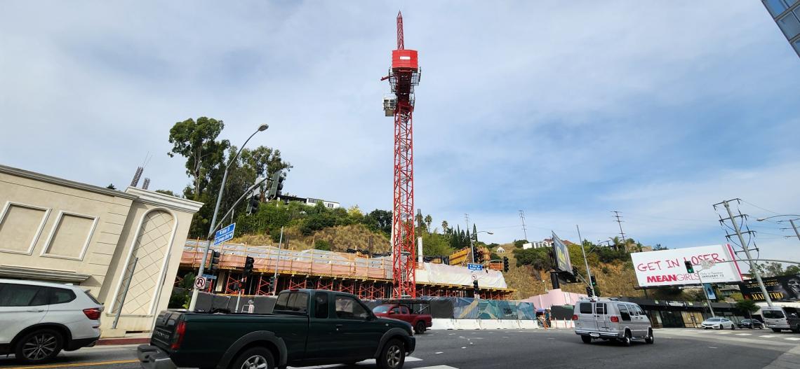 At the intersection of Sunset and La Cienega Boulevards in West Hollywood, the presence of a red tower crane demonstrates progress on new billboard which happens to have an office building inside.