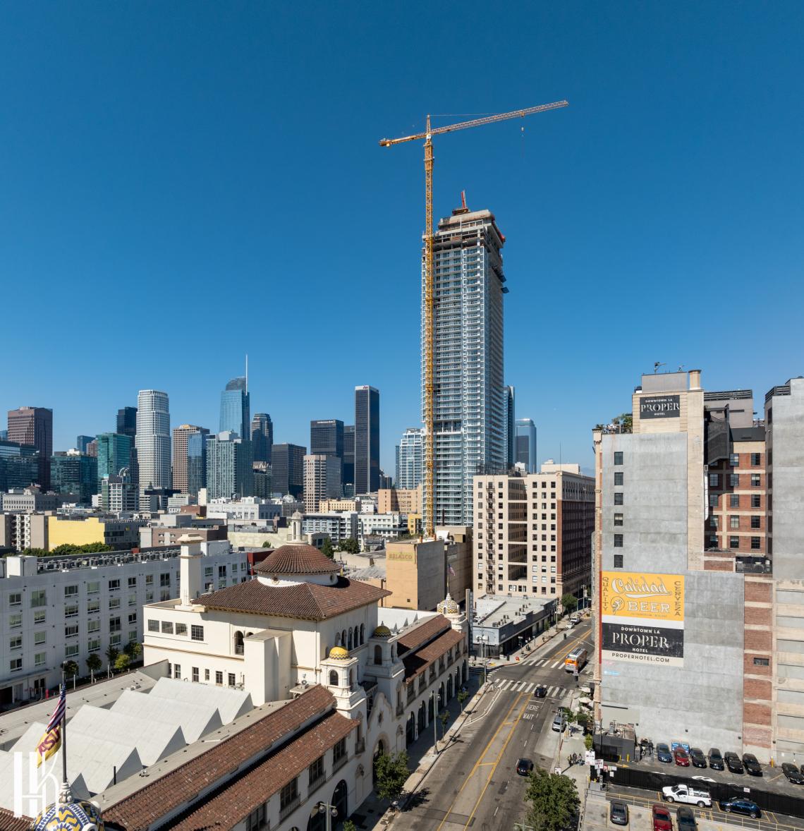 A half-year since we last checked in, Onni Group's latest apartment tower has reached its peak at the intersection of Olympic Boulevard and Hill Street in Downtown Los Angeles.
