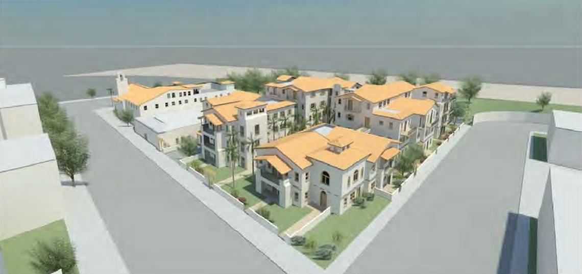 A possible look for the Washington View development is revealed in 2015 plans by JAG Architects, which called for a handful of two-to-four-story buildings designed in the same Spanish Colonial Revival style as the Pierce Brothers Mortuary. A site plan indicated multiple green spaces interspersed throughout the new construction, as well as the potential for a new parking garage at the center of the property, and the reactivation of the historic building with street-level commercial space.