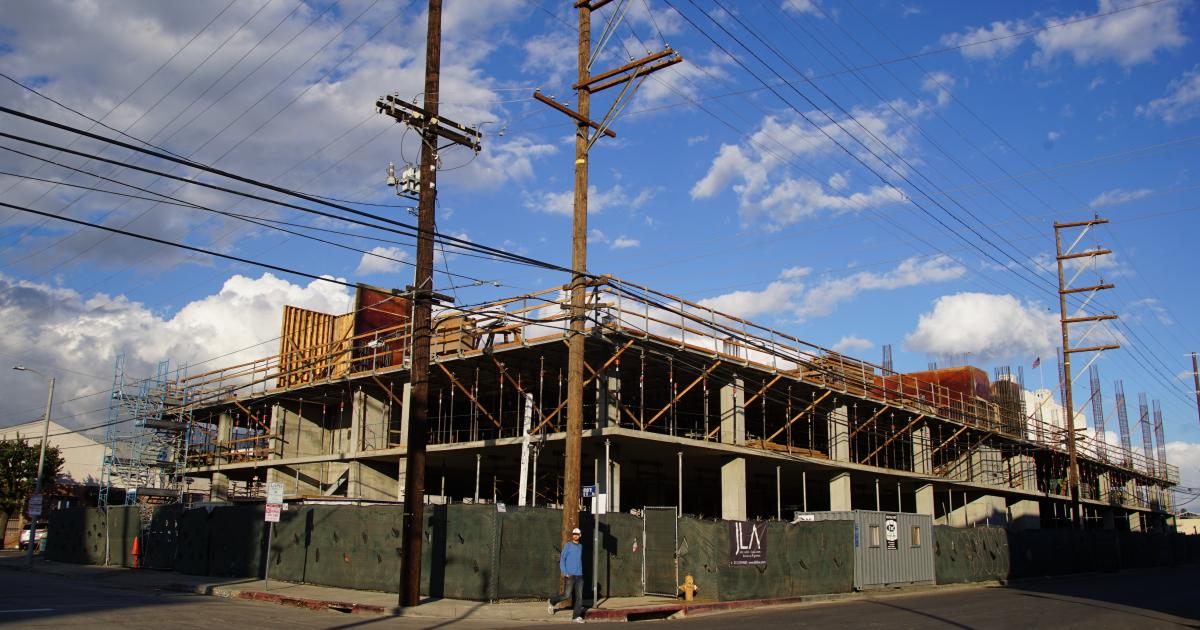 At 1001 N. Orange Drive, work has progressed above street level for a six-story structure that will feature two floors of production space atop a four-story parking podium.  The property was previously home to standalone industrial building which was destroyed by a fire in 2014.