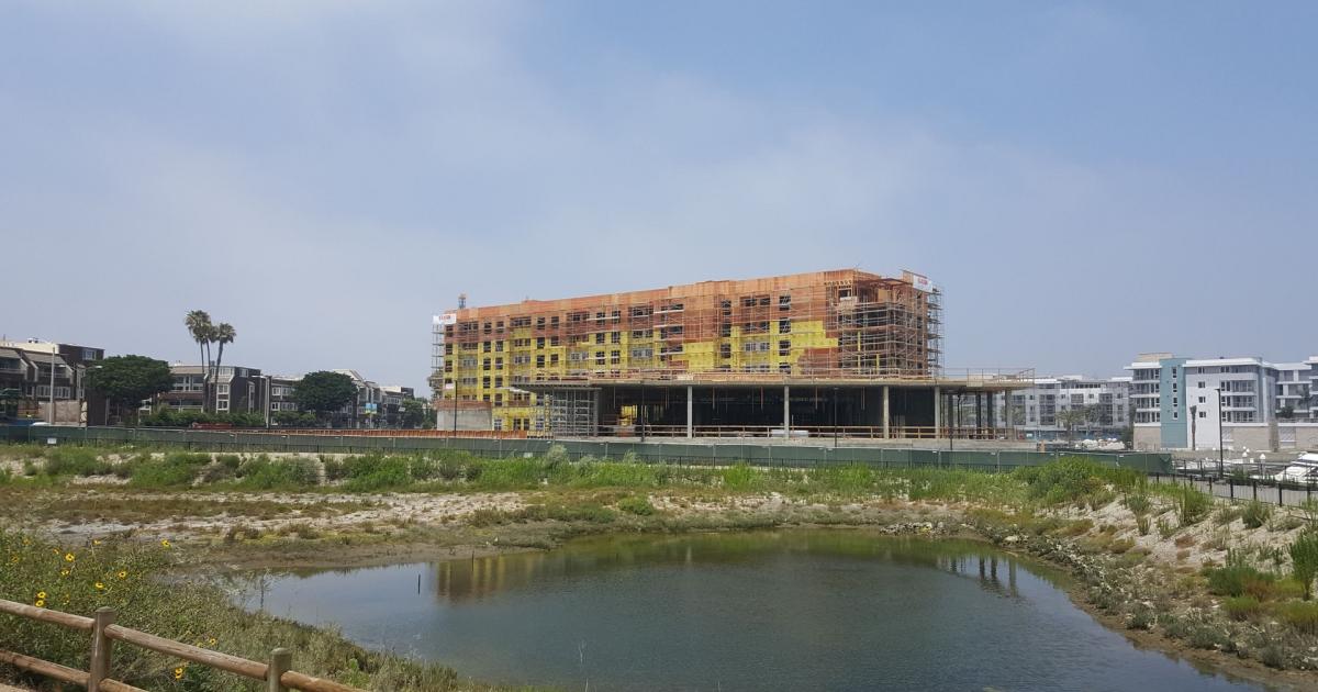 After more than a year of construction, the wood frame of a dual-branded Marriott hotel is now half-complete in Marina del Rey.
