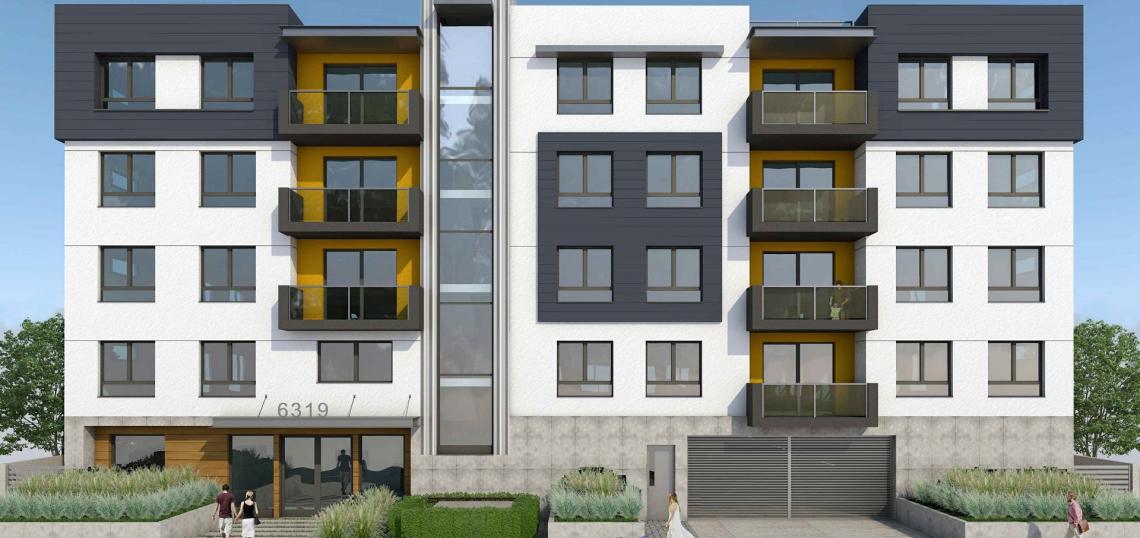 GA Engineering is designing 6313 Brynhurst, which is portrayed in renderings as a contemporary podium-type building clad in painted stucco and fiber cement boards. Besides housing, plans call for a recreation room on the ground-floor and a central courtyard.