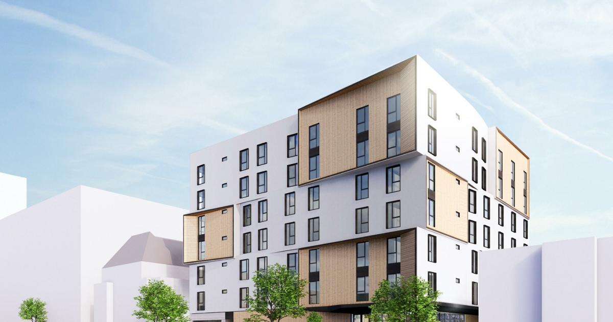 OfficeUntitled is designing the apartment complex, which is depicted as a white stucco building highlighted by a series of boxy protrusions clad in wood paneling. Architectural plans show a rooftop deck as well as a gym and other amenities at street level.