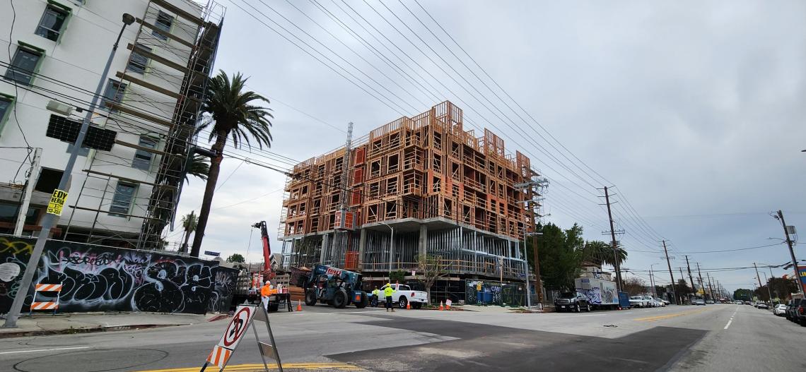 One year after starting work, a mixed-use apartment complex from Los Angeles-based Canfield Development is rising quickly just west of Metro's Vermont/Santa Monica Station in East Hollywood,