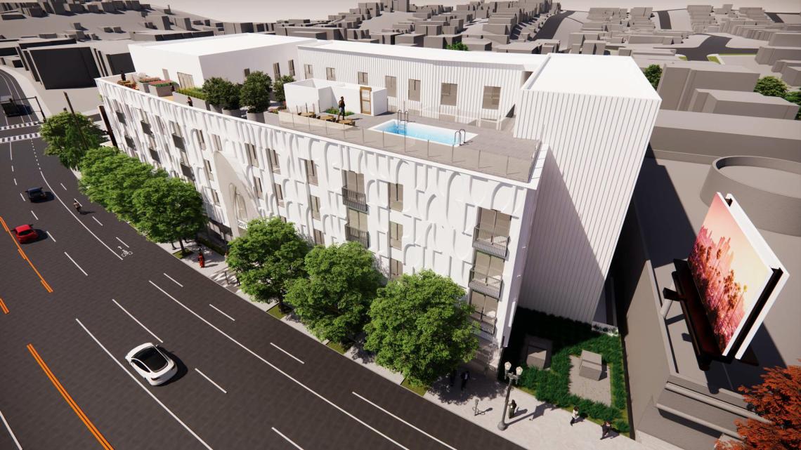 Tighe Architecture is designing 2511 Sunset Boulevard, which would have an O-shaped footprint wrapping a central courtyard. Proposed amenities include a rooftop pool deck.