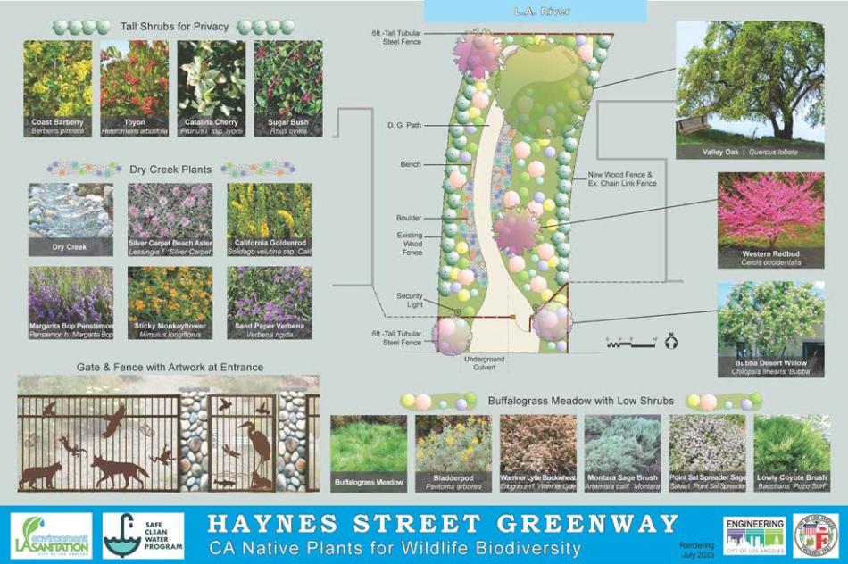 The Haynes Street Greenway project, will take shape on an empty 5,000-square-foot plot at 19941 Haynes Street that covers a nine-foot box culvert which allows stormwater to flow into the L.A. River. Plans call for improving the space with new landscaping, trees, outdoor seating, and a textured concrete path. plans also call for new fencing. The greenway would also provide a new entry point to a stretch of the L.A. River bike path which runs behind the parcel.
