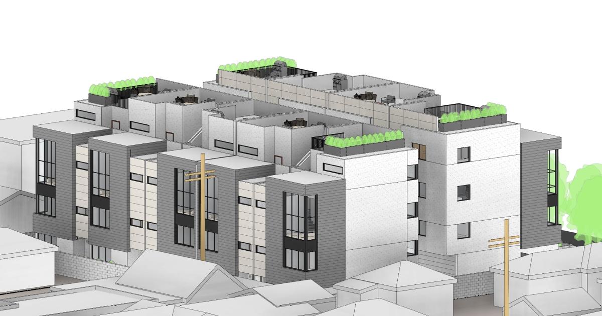 Renderings depict a series of four-story buildings, aligned along a common central driveway. Each would include three bedrooms, a two-car garage, and a rooftop deck.