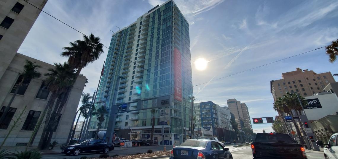 IBI Group group is listed as the architect of record for the project, which includes a 252-foot-tall high-rise that now ranks as one of the tallest buildings in Long Beach. The tower and the adjacent podium-type building wrap a central courtyard, which opens to the street. Resident amenities include a theater room, a pool deck, a gym, and co-working space.