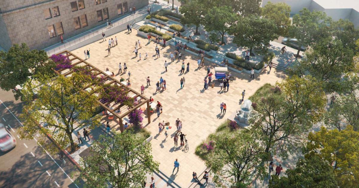 Piazza Miramare, which officially broke ground in late 2022, occupies a site at 6th Street and Harbor Boulevard, adjacent to San Pedro City Hall. The space, which was previously known as Pepper Tree Plaza, is being rebuilt as a more usable area with features such as terrace seating, a new trellis structure to provide shade, and a fountain at its northern end.