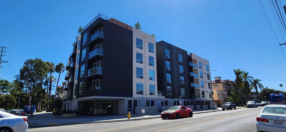 The project at 3301 Canfield Avenue, which replaced three single-family homes and a triplex, consists of a six-story building featuring 50 three-bedroom apartments above parking for 25 vehicles. Building permits also indicate that some ground-floor parking is being converted into 12 accessory dwelling units.