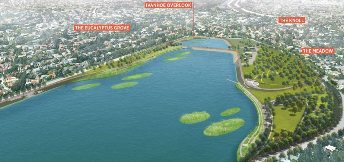 The preferred concept divides the complex into seven different areas - the Ivanhoe Overlook, the Eucalyptus Grove, the West Narrows, the South Valley, the East Narrows, the Meadow, and the Knoll - which would be connected by a meandering pedestrian path. If fully implemented, the project could result in up to 23 acres of park space along the perimeter of the reservoir, 12 acres of which does not exist today.