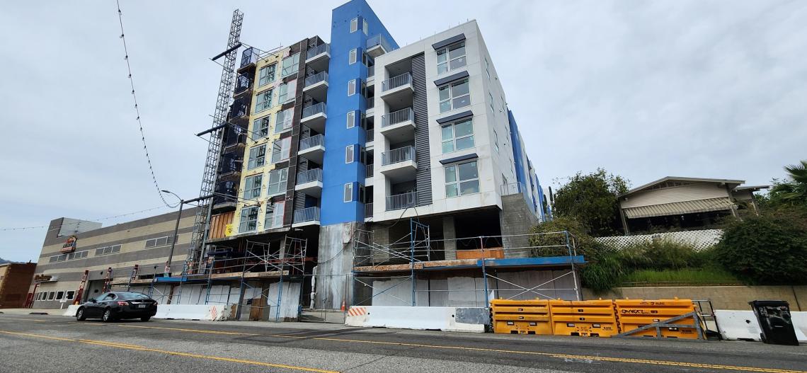 In Downtown San Pedro, the stucco of exterior of a new mixed-use apartment building from South Bay Developers is taking shape at 444 W. 5th Street.