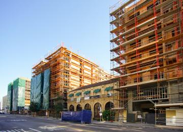 Nine months after going up in smoke, construction of the mixed-use development is back on track.